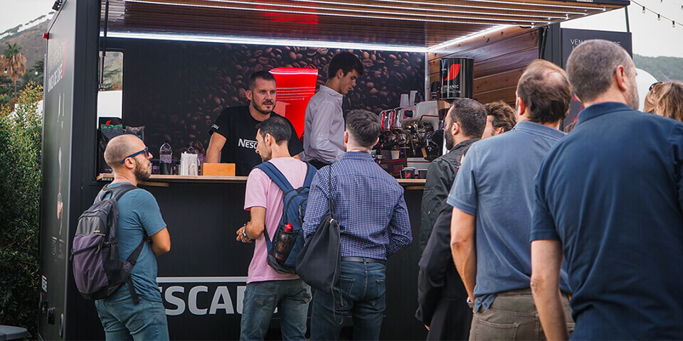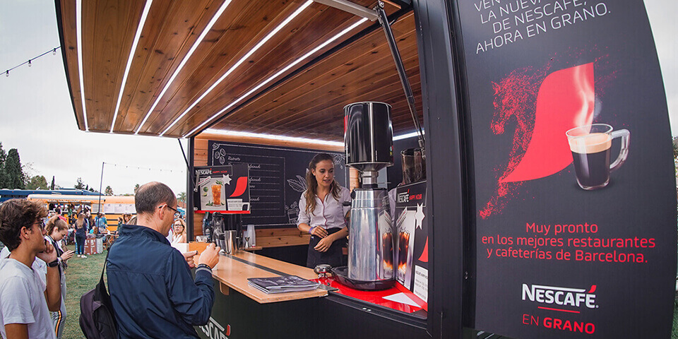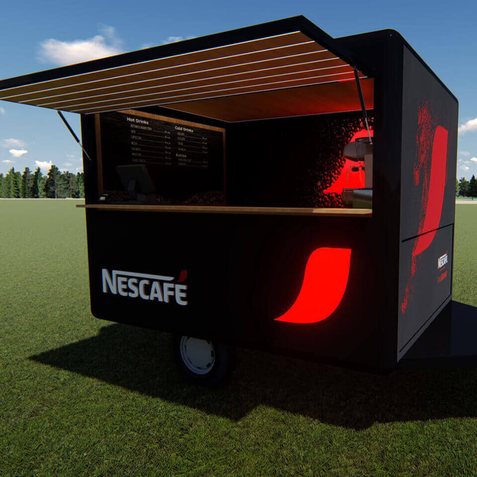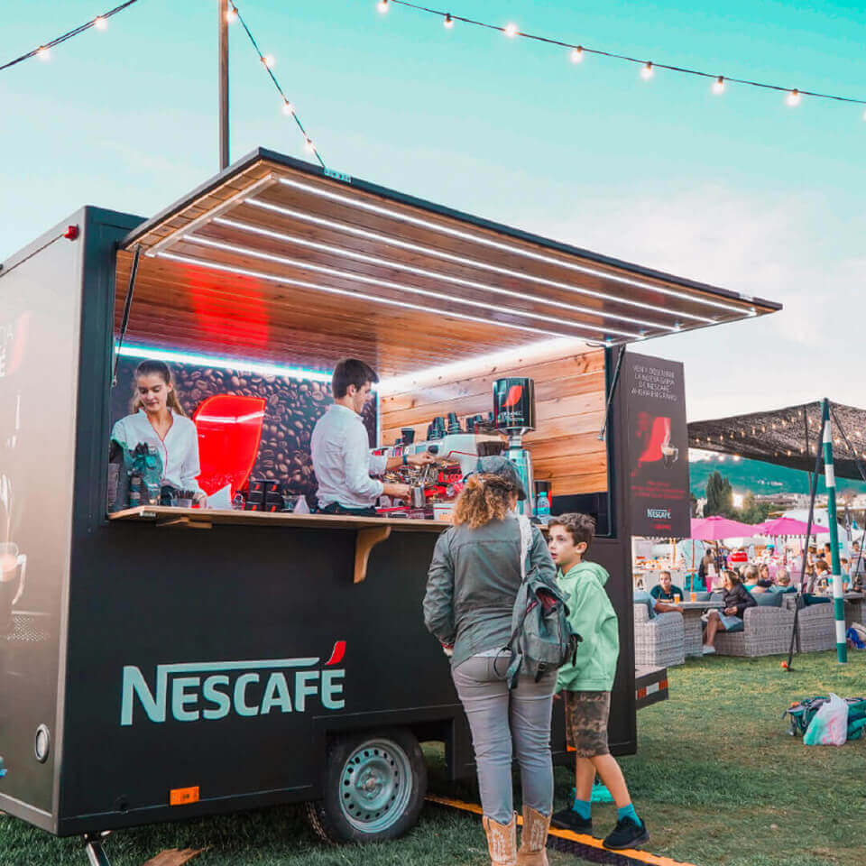 In the international Horse Jumping competition there is a trendy area with food and entertainment where Nescafé wanted to be present. This was the reason why we designed a modern and functional trailer that was noticed at the festival.